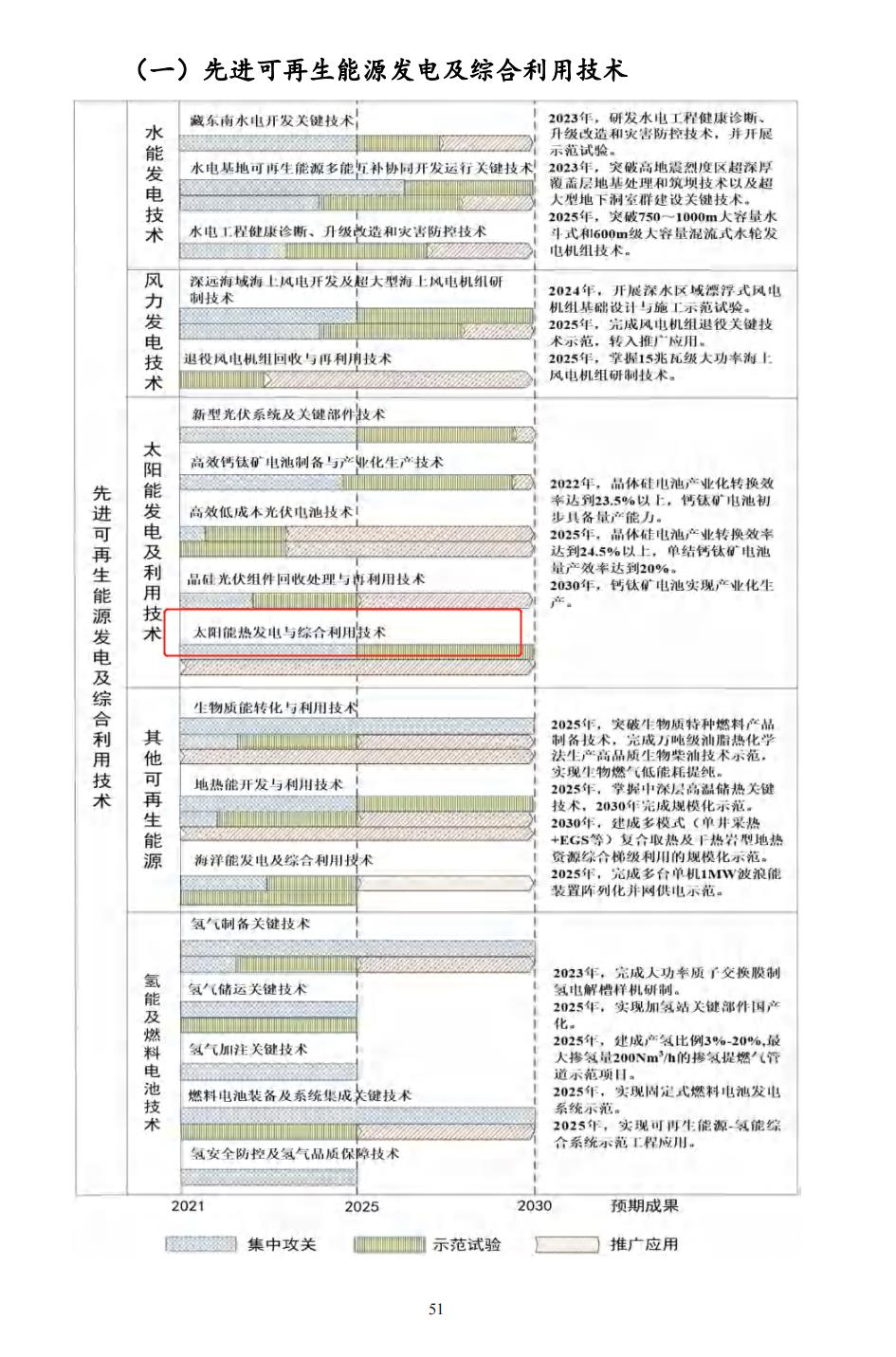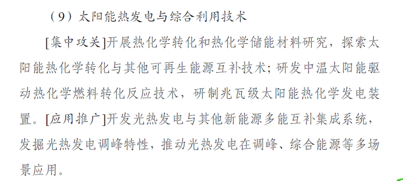 在“太阳能热发电与综合利用技术”方面,[集中攻关]开展热化学转化和热化学储能材料研究,探索太阳能热化学转化与其他可再生能源互补技术;研发中温太阳能驱动热化学燃料转化反应技术,研制兆瓦级太阳能热化学发电装置。[应用推广]开发光热发电与其他新能源多能互补集成系统,发掘光热发电调峰特性,推动光热发电在调峰、综合能源等多场景应用。