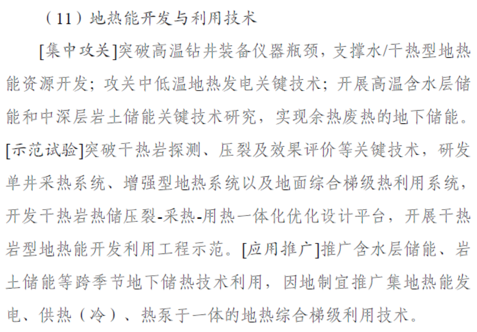 在“地热能开发与利用技术”方面,应用推广]推广含水层储能、岩土储能等跨季节地下储热技术利用,因地制宜推广集地热能发电、供热(冷)、热泵于一体的地热综合梯级利用技术。