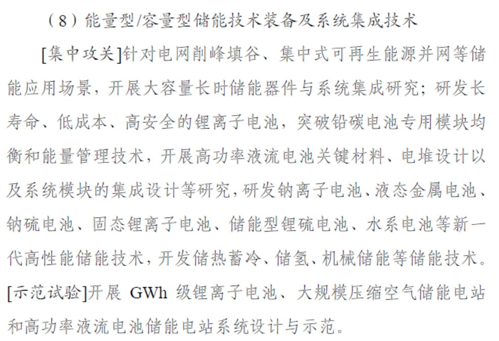 在“能量型/容量型储能技术装备及系统集成技术”方面,[集中攻关]针对电网削峰填谷、集中式可再生能源并网等储能应用场景...开展大容量长时储能器件与系统集成研究;开发储热蓄冷、储氢、机械储能等储能技术。