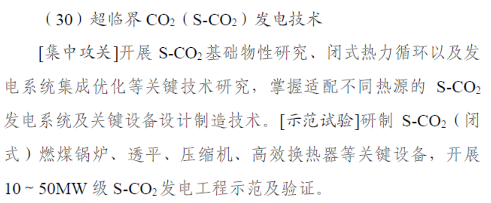 在“超临界 CO₂(S-CO₂)发电技术”方面,[集中攻关 ]开展 S-CO₂基础物性研究、闭式热力循环以及发电系统集成优化等关键技术研究,掌握适配不同热源的 S-CO₂发电系统及关键设备设计制造技术。 [示范试验 ]研制 S-CO₂(闭式)燃煤锅炉、透平、压缩机、高效换热器等关键设备,开展10~50MW级 S-CO₂发电工程示范及验证。
