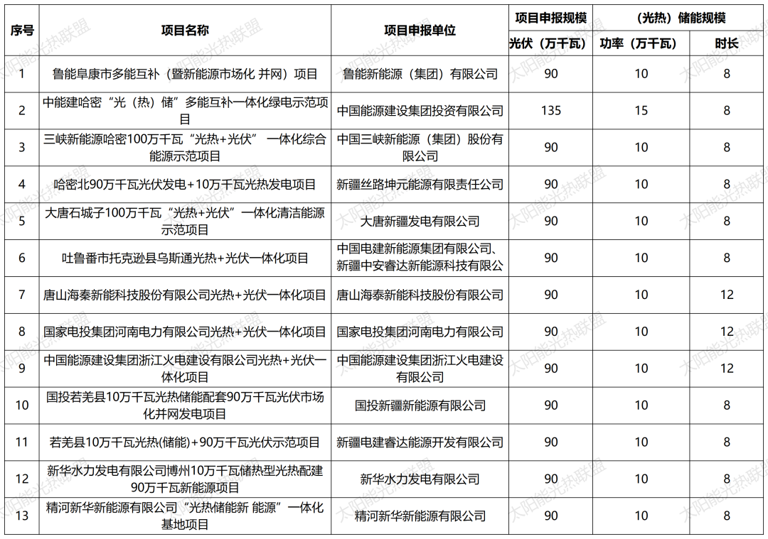 此前,新疆2022年第二批市场化并网新能源项目清单明确,其中13个储热型光热发电项目被列入需电网消纳项目【详见下表】,均采用光伏+储热型光热发电的配置方案,光伏装机总规模为1215万千瓦,光热总装机高达135万千瓦,配储比例在11%左右。