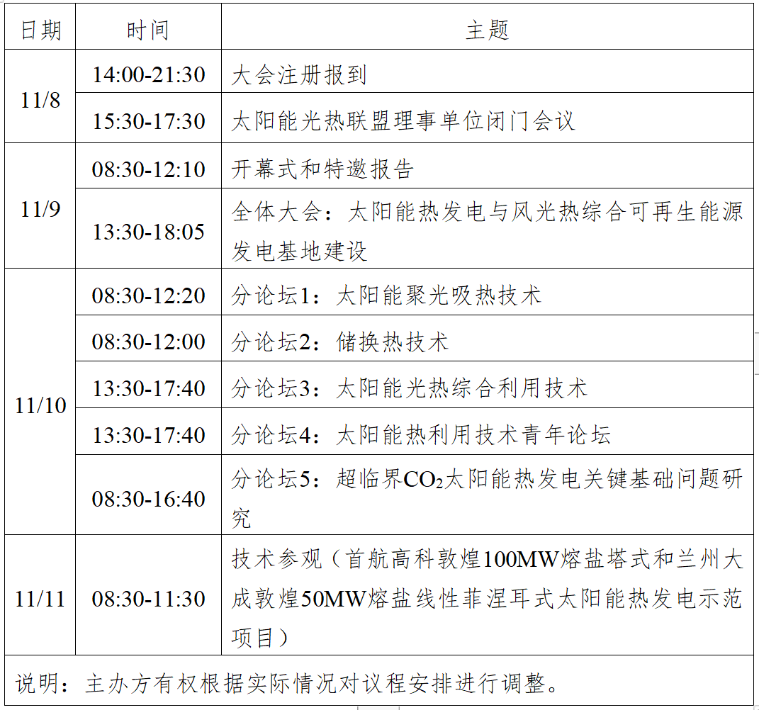 大会还得到了北京佳洁能新节能技术有限公司、成都禅德太阳能电力有限公司、北京天瑞星光热技术有限公司、常州龙腾光热科技股份有限公司的大力支持。大会期间,联合承办、协办单位、支持单位以及艾杰旭特种玻璃(大连)有限公司、河北道荣新能源科技有限公司、哈尔滨汽轮机厂有限责任公司、北京雅世恒源科技发展有限公司、青岛艾迪森科技股份有限公司、山西沃锦新材料股份有限公司、中国科学院电工研究所等单位将进行展览展示。大会拟定日程如下: