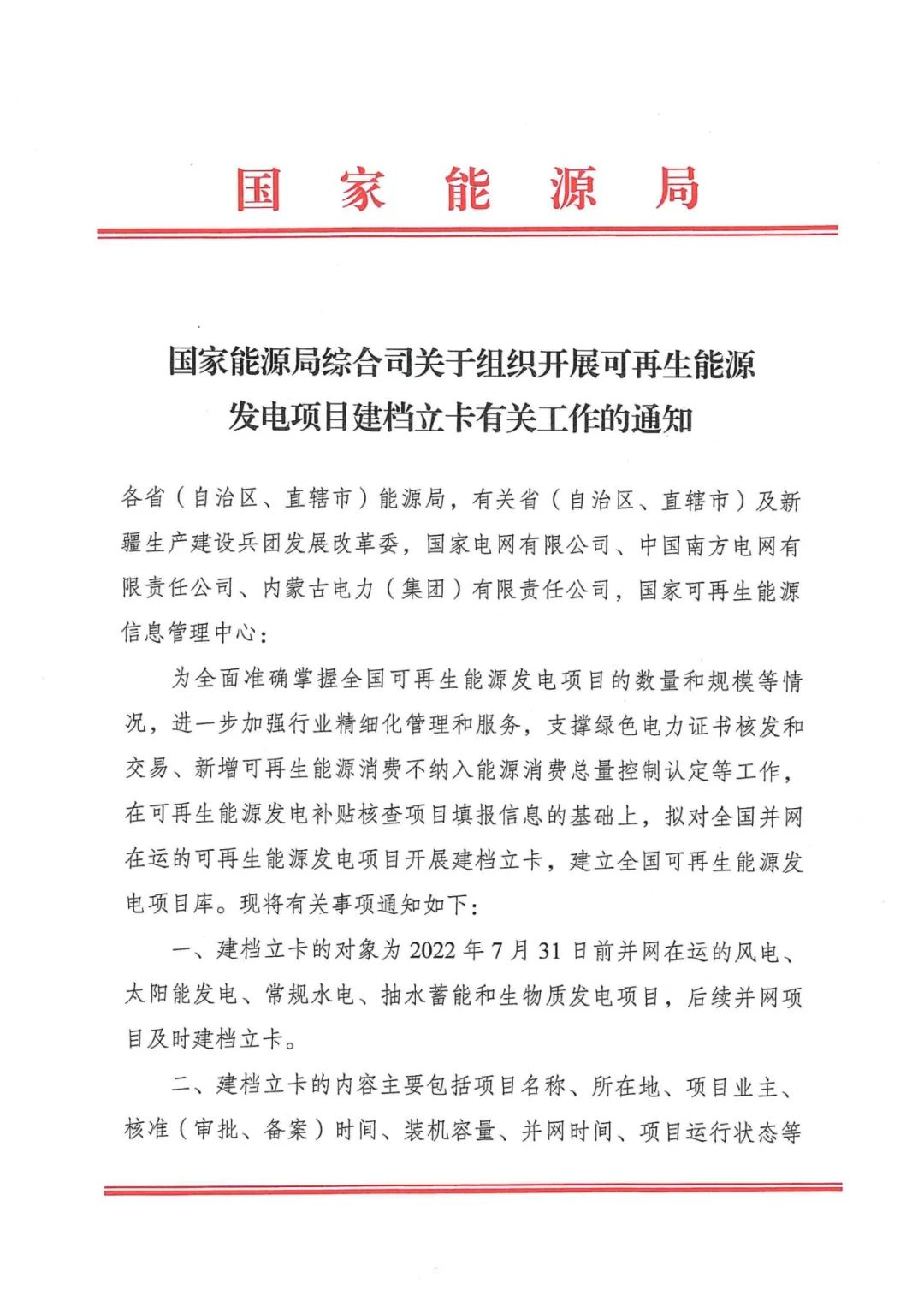 近日,国家能源局综合司印发《关于组织开展可再生能源发电项目建档立卡有关工作的通知》。《通知》提出,在可再生能源发电补贴核查项目填报信息的基础上,拟定全国并网在运的可再生能源发电项目开展建档立卡,建立全国可再生能源发电项目库。建档立卡的对象为2022年7月31日前并网在运的风电、 太阳能发电、常规水电、抽水蓄能和生物质发电项目,后续并网项目及时建档立卡。