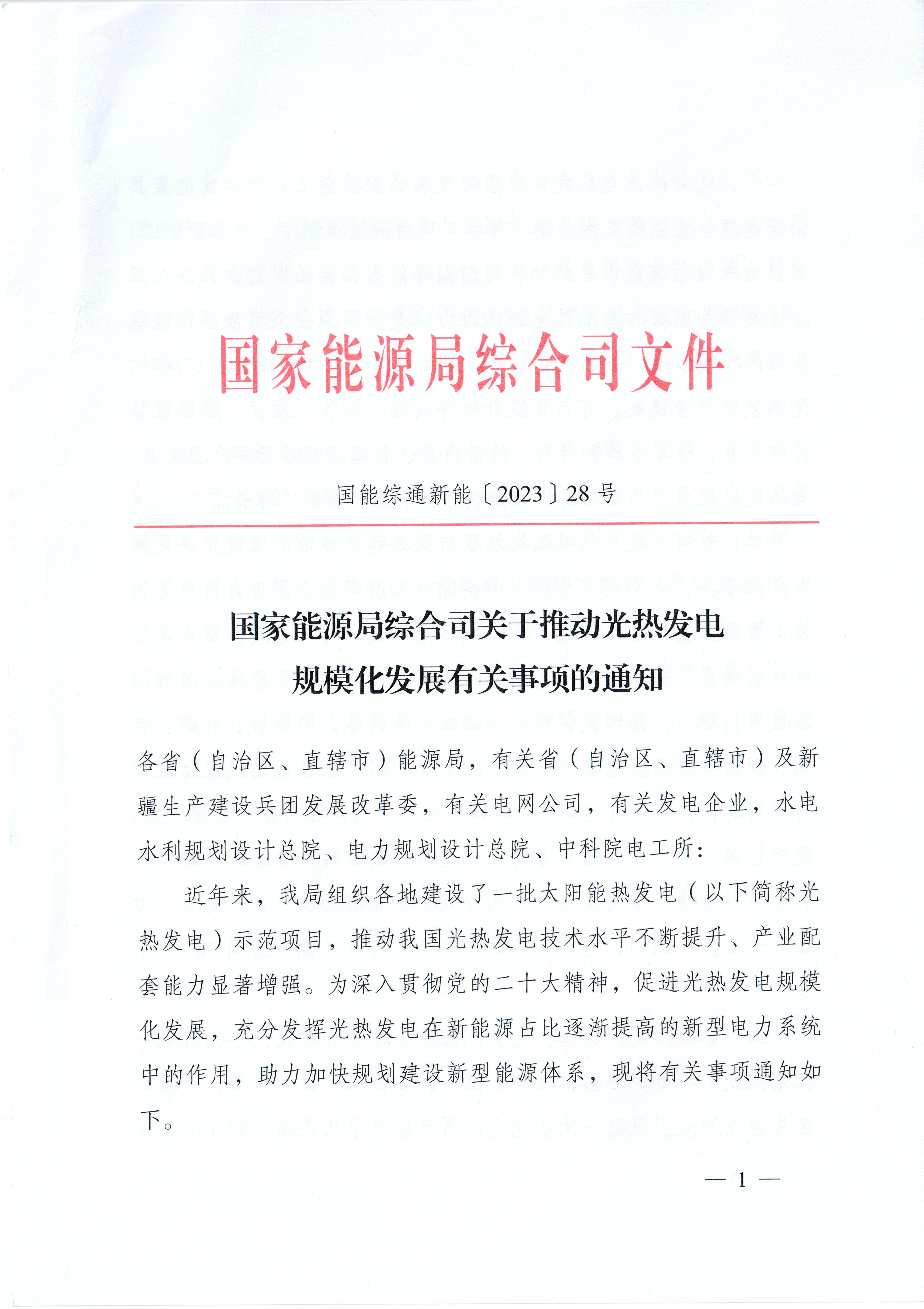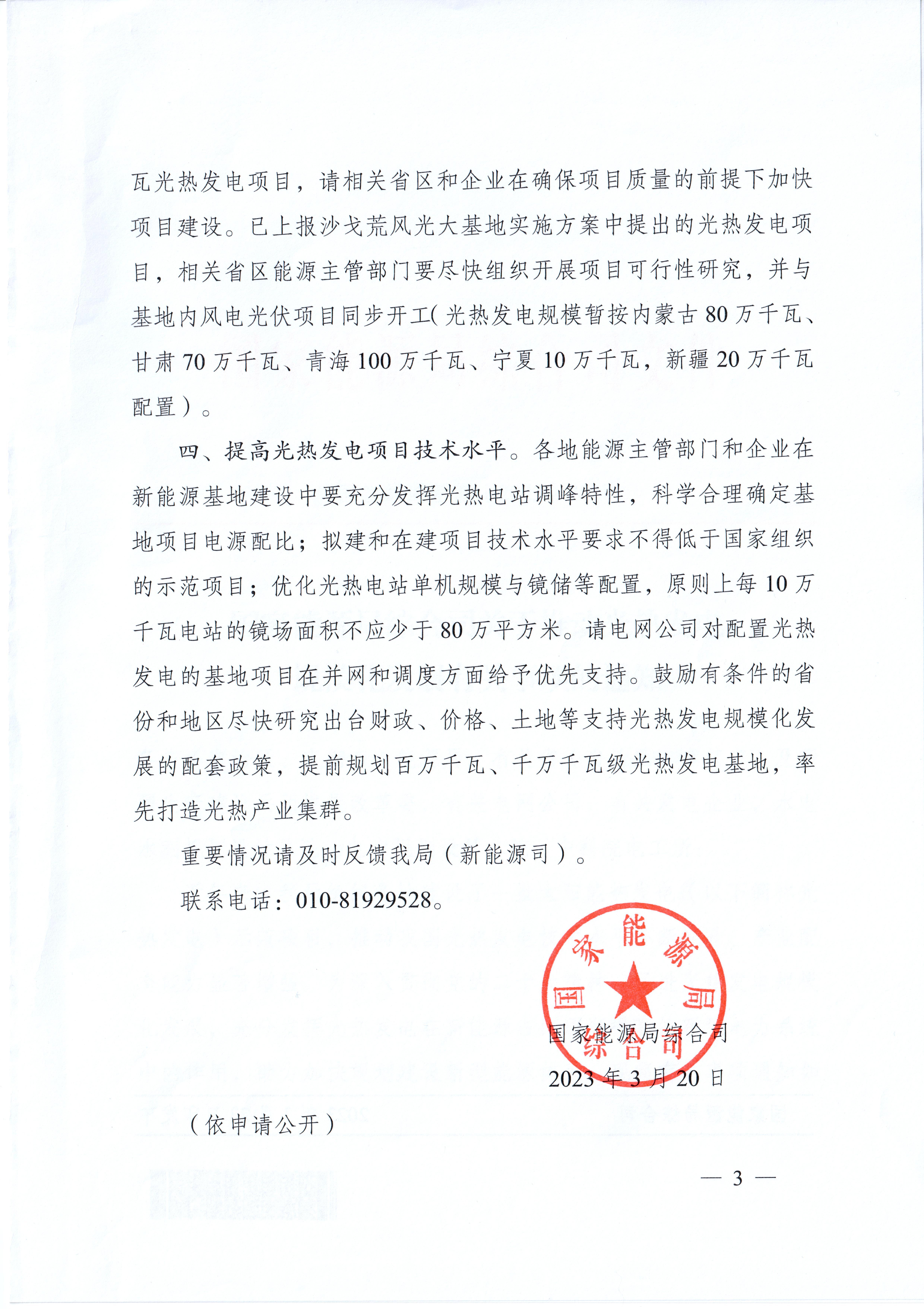 国家能源局综合司关于推动光热发电规模化发展有关事项的通知