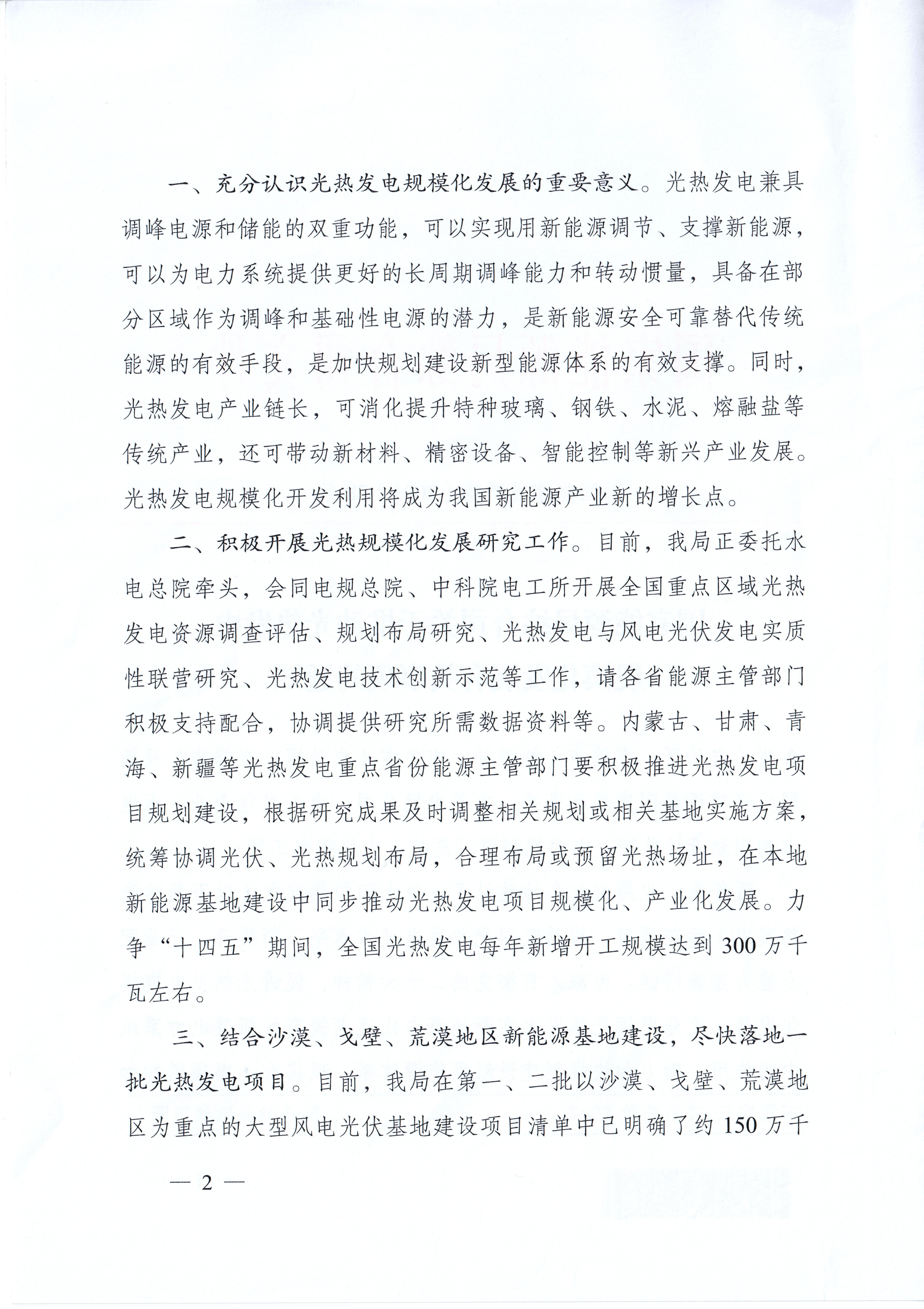 二、积极开展光热规模化发展研究工作。目前,我局正委托水电总院牵头,会同电规总院、中科院电工所开展全国重点区域光热发电资源调查评估、规划布局研究、光热发电与风电光伏发电实质性联营研究、光热发电技术创新示范等工作,请各省能源主管部门积极支持配合,协调提供研究所需数据资料等。内蒙古、甘肃、青海、新疆等光热发电重点省份能源主管部门要积极推进光热发电项目规划建设,根据研究成果及时调整相关规划或相关基地实施方案,统筹协调光伏、光热规划布局,合理布局或预留光热场址,在本地新能源基地建设中同步推动光热发电项目规模化、产业化发展,力争“十四五“期间,全国光热发电每年新增开工规模达到300万千瓦左右。