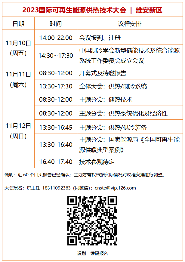2023第三届国际可再生能源供热技术大会定于11月11日~12日在河北雄安新区组织召开。为期两天的会议将集中展示可再生能源供热及制冷领域最新技术、研究成果以及工程应用等。诚邀行业领导专家莅临参会,共促清洁供热发展,助力“双碳”目标实现。