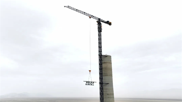 吸热塔转换层平台起到对吸热器的直接支撑作用,需承受上千吨的设备重量及镜场反射的高密度光能冲击,同时肩负吸热器与周围定日镜阵列的光路精确对齐,以最大化光热转换效率的重任。为确保吊装工作顺利、安全进行,项目部提前召开专项会议,对吊装前后三天的天气进行了对比、研究,根据风速以及风向规律,择时进行吊装。吊装过程中,现场施工人员严格依照吊装方案执行,现场指挥指令明确,确保了第一榀钢架的顺利就位。