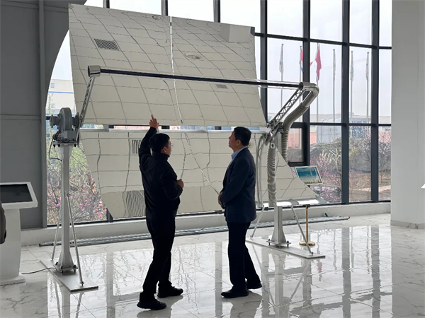 在企业展厅内,总经理王宇对XC32型槽式集热器、反射镜、复合抛物面太阳能聚光器(CPC)、太阳能集热管等核心产品进行系统讲解。他表示,这些产品深度融合企业技术创新成果,充分体现新能源领域前沿发展趋势与技术突破方向。领导一行认真听取产品讲解,结合技术参数、应用场景及市场前景等关键环节进行现场交流,围绕产品性能优势、产业化路径等内容展开深入探讨。