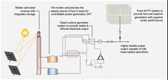 其实,美国新月沙丘塔式熔盐热发电项目就采用了光热+光伏的混合设计,其光热发电的净容量为100MWe,光伏发电容量为60MW,但未选择利用光伏的电力进行热存储。