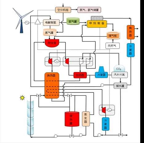 图17 槽式太阳能热发电与风电和燃气发电制氢制甲烷循环热发电