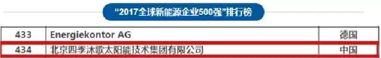 近日,“2017全球新能源企业500强榜单”在“"一带一路"国际能源高峰论坛暨第七届全球新能源企业500强峰会”上发布。上榜企业分别来自34个国家和地区。太阳能中低温太阳能热利用领军企业——四季沐歌集团位列434位,连续3年强势入榜,续写太阳能中低温太阳能热利用行业传奇。