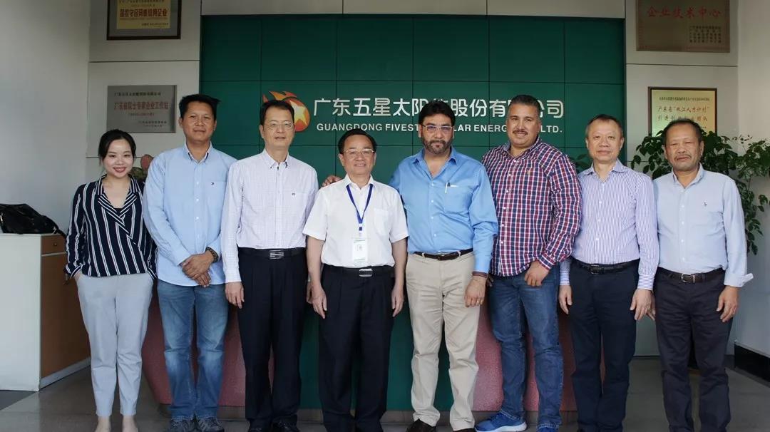 10月30日下午,由中国国际贸易促进委员会东莞市委员会(简称东莞市贸促会)会长曾民盛带队,墨西哥候任总统特使Juan Gim、墨西哥候任总统特使助理Carlos Simentail、墨西哥候任总统特使助理Alponso Chong、墨中商贸旅游促进会会长Ken Lau等成员组成的商贸交流团一行10余人来到广东五星太阳能股份有限公司(简称五星太阳能)参观考察,寻求与墨西哥新能源推广工作相匹配的结合点。