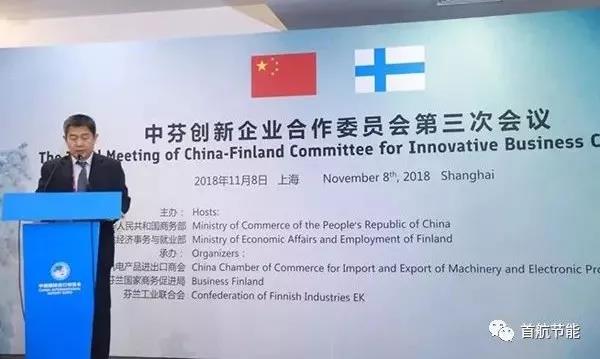 近日,中芬创新企业合作委员会(以下简称“企委会”)第三次会议作为首届中国国际进口博览会配套活动之一,在国家会展中心(上海)举行。中国商务部欧洲司商务参赞(正司级)翟谦、芬兰外贸与发展部部长安奈-玛丽·维利莱宁、芬兰经济与就业部国务秘书古泽森作为双方政府高层代表出席会议,北京首航艾启威节能技术股份有限公司(下文简称首航节能)黄卿乐副董事长作为代表参加会议。