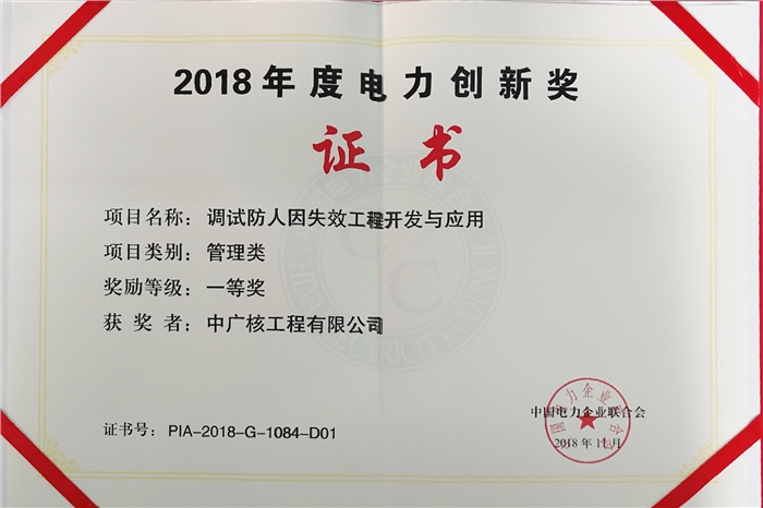 11月28日,由中国电力企业联合会发起的2018年电力创新成果评选活动在成都落下帷幕。由中广核工程有限公司牵头申报的《调试防人因失效工程开发与应用》获得2018年度电力创新奖管理类一等奖。